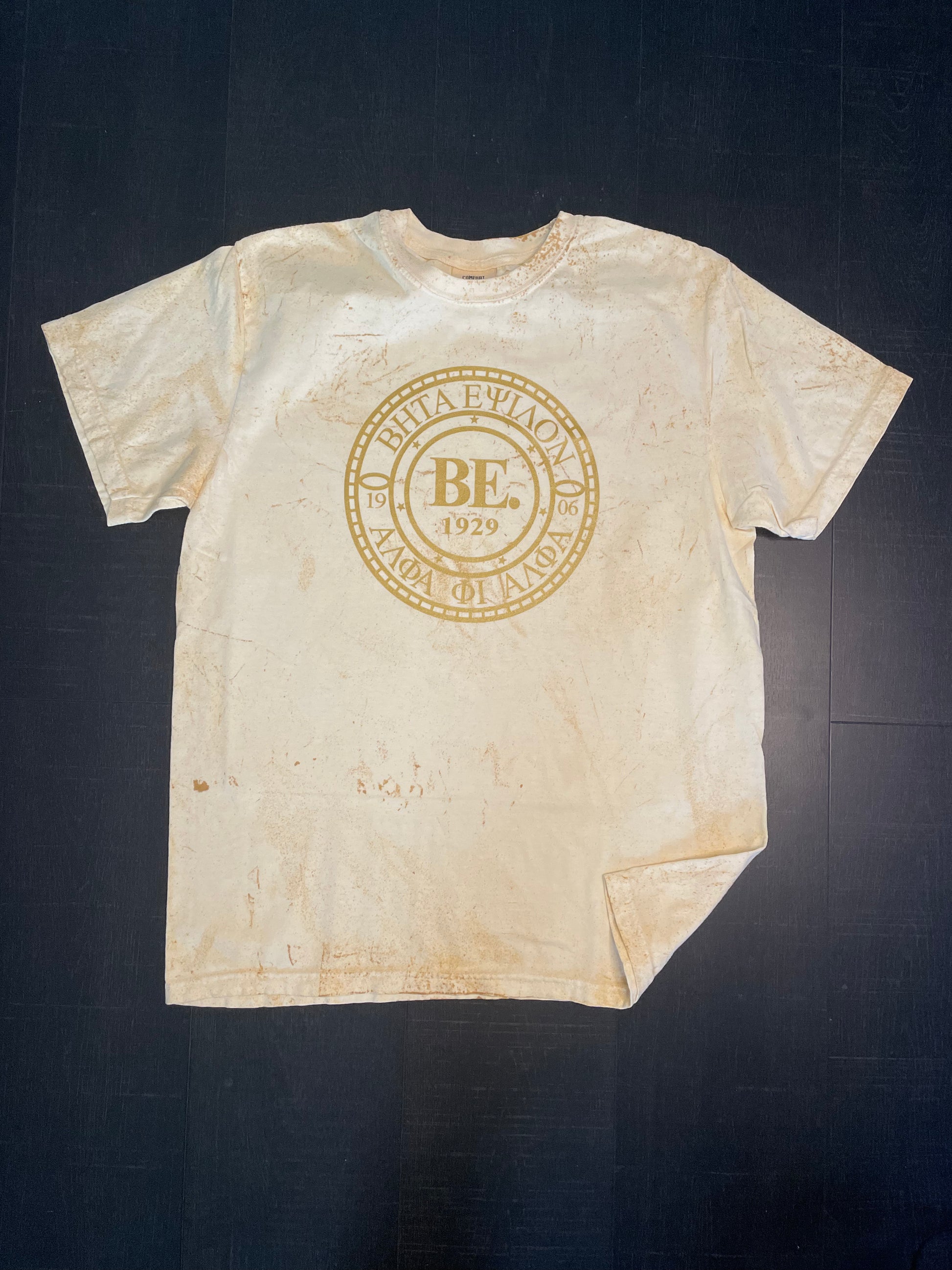 A soft cotton tee emblazoned with an Old Gold seal with Beta Epsilon in Greek Letters.